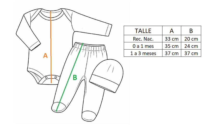 Podés chequear los talles comparando la tabla de las medidas con un body que le quede bien a tu bebé.