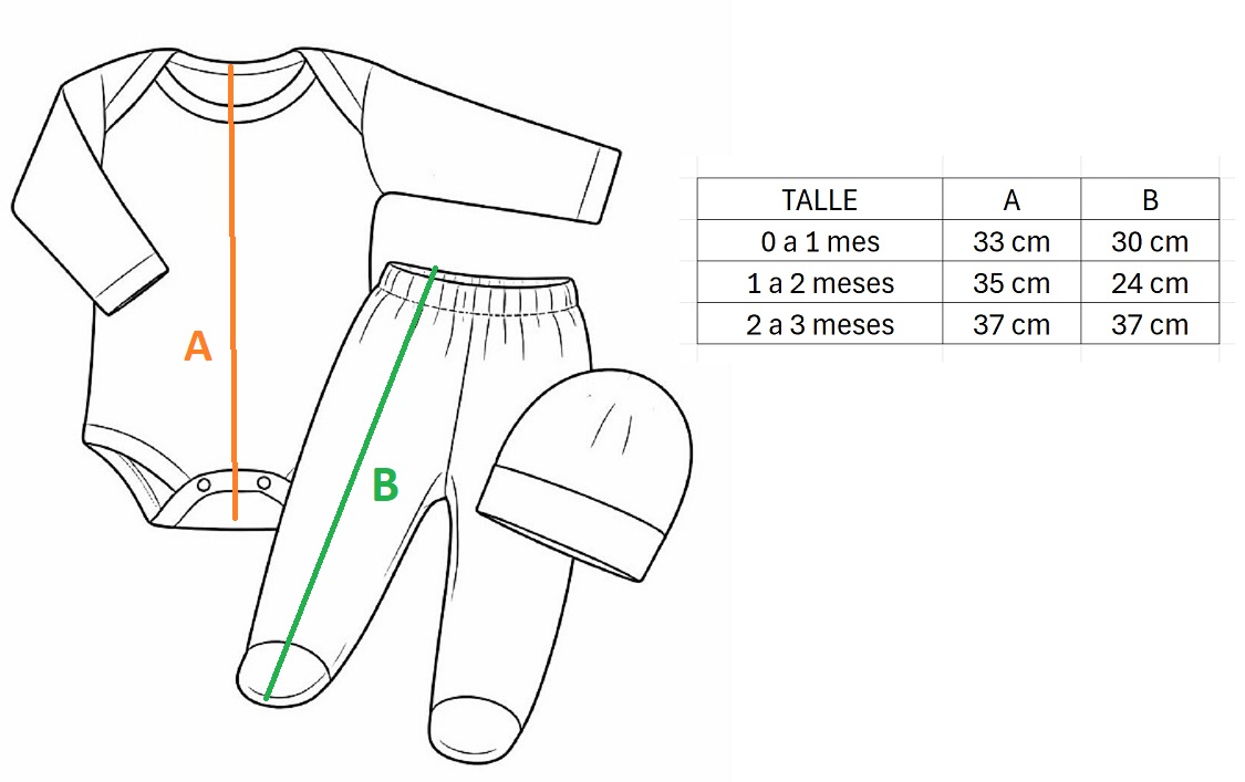Podés chequear los talles comparando la tabla de las medidas con un body que le quede bien a tu bebé.