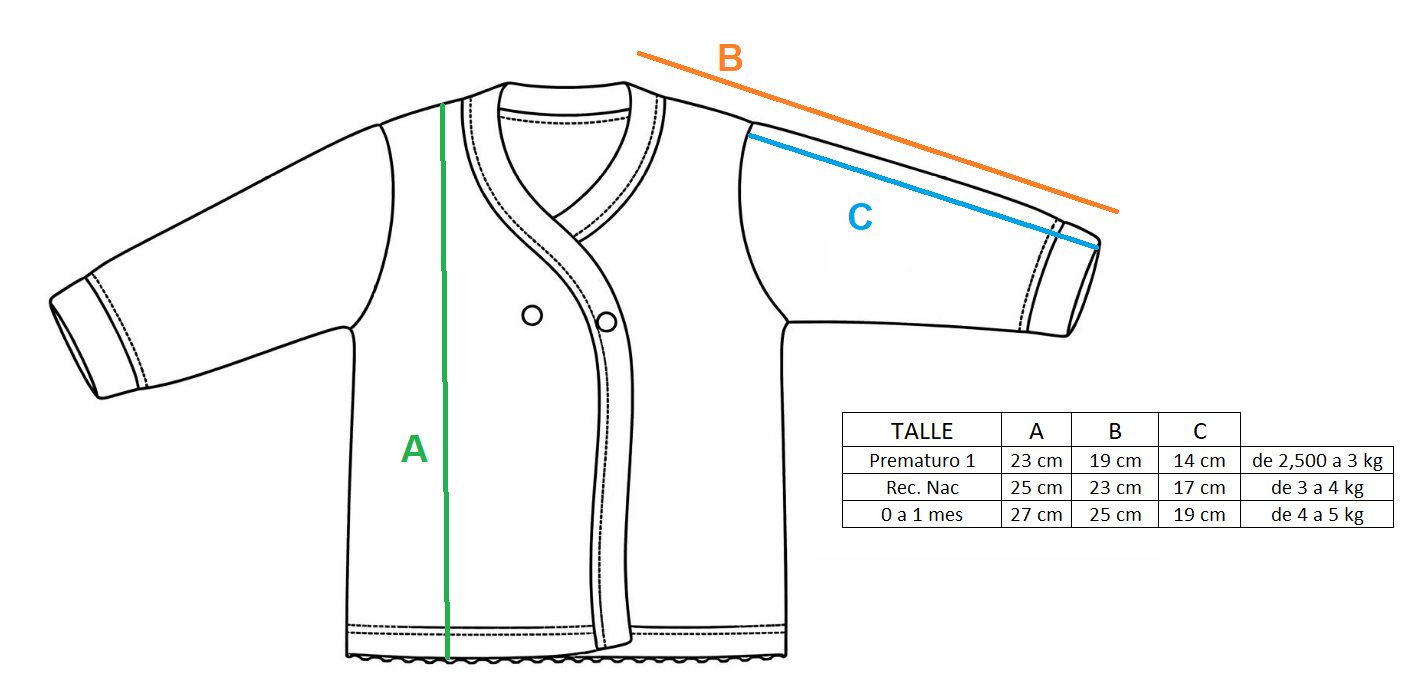 IMPORTANTE - Viene en talle prematuro (2,500 kg a 3 kg), Rec. Nac. (3 a 4 kg) y 0/1 mes (4 a 5 kg) Estos pesos son estimativos, porque depende la contextura y el largo del bebé, te sugerimos ver las medidas que te dejamos abajo y compararlas con lo que mide una prenda que use tu bebé ahora.
