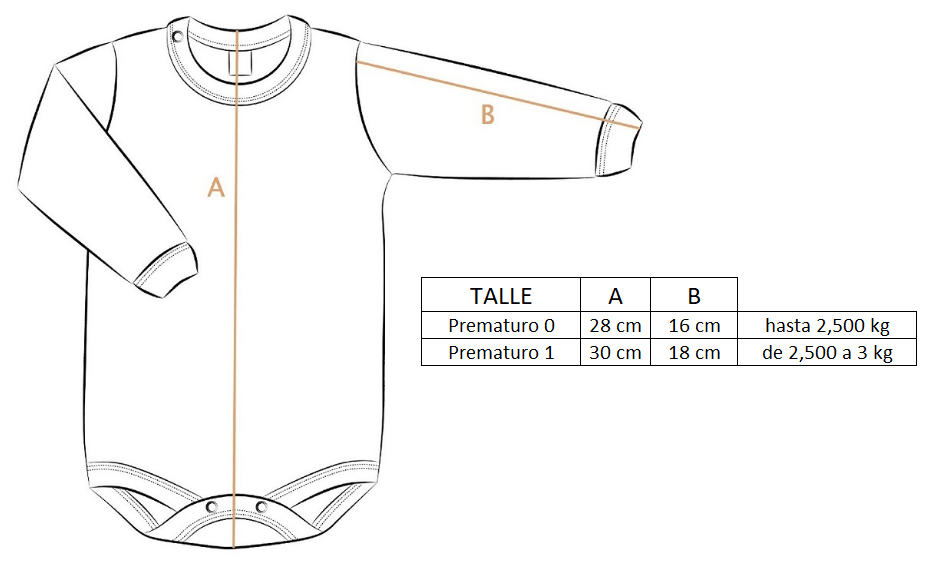 IMPORTANTE - Hay dos talles, prematuro 0 (hasta 2,500 kg) y premauro 1 (2,500kg a 3 kg) Estos pesos son estimativos, porque depende la contextura y el largo del bebé, te sugerimos ver las medidas que te dejamos abajo y compararlas con lo que mide una prenda que use tu bebé ahora.
