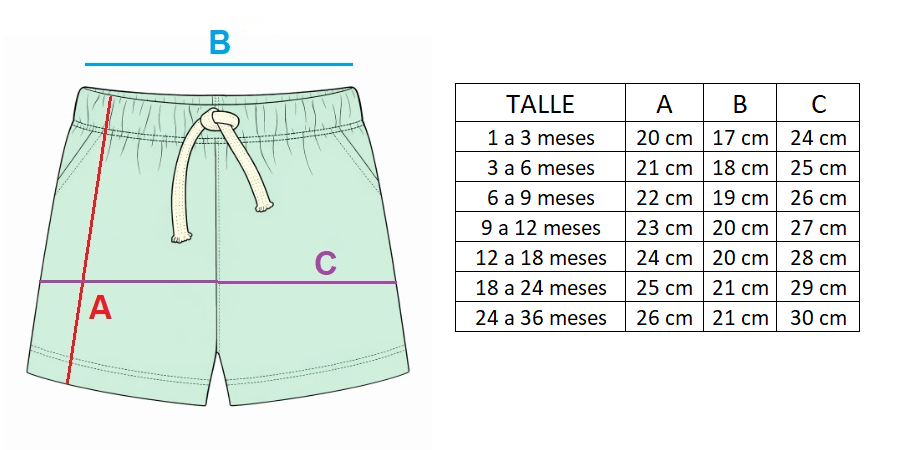 Podés chequear los talles comparando la tabla de medidas con un short que le quede bien a tu bebé.