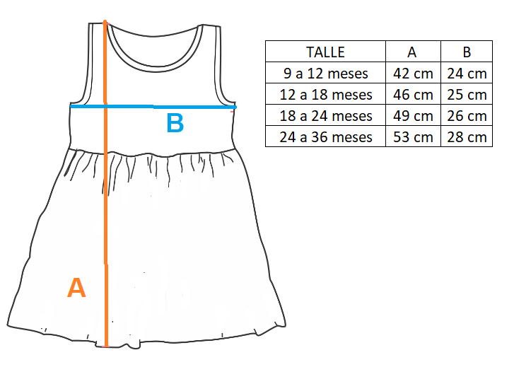 Podés chequear los talles comparando la tabla de medidas con un vestido o prenda similar que le quede bien a tu beba